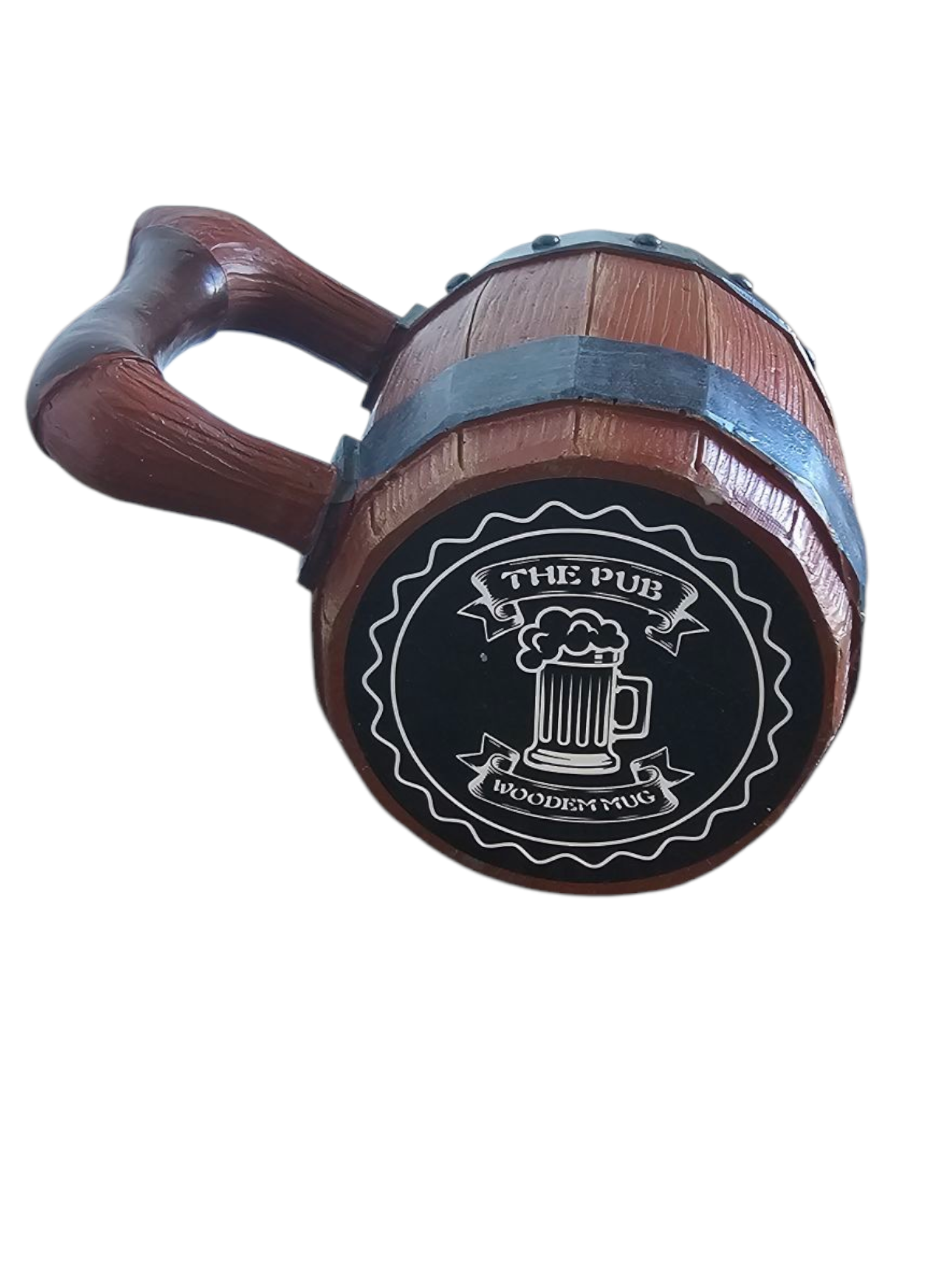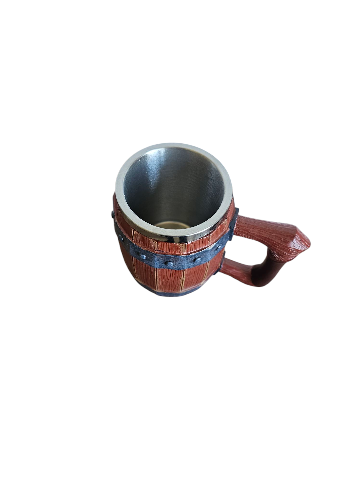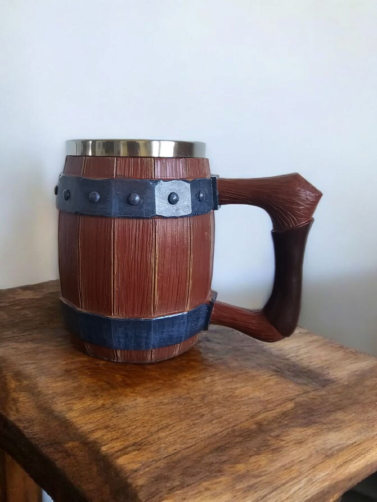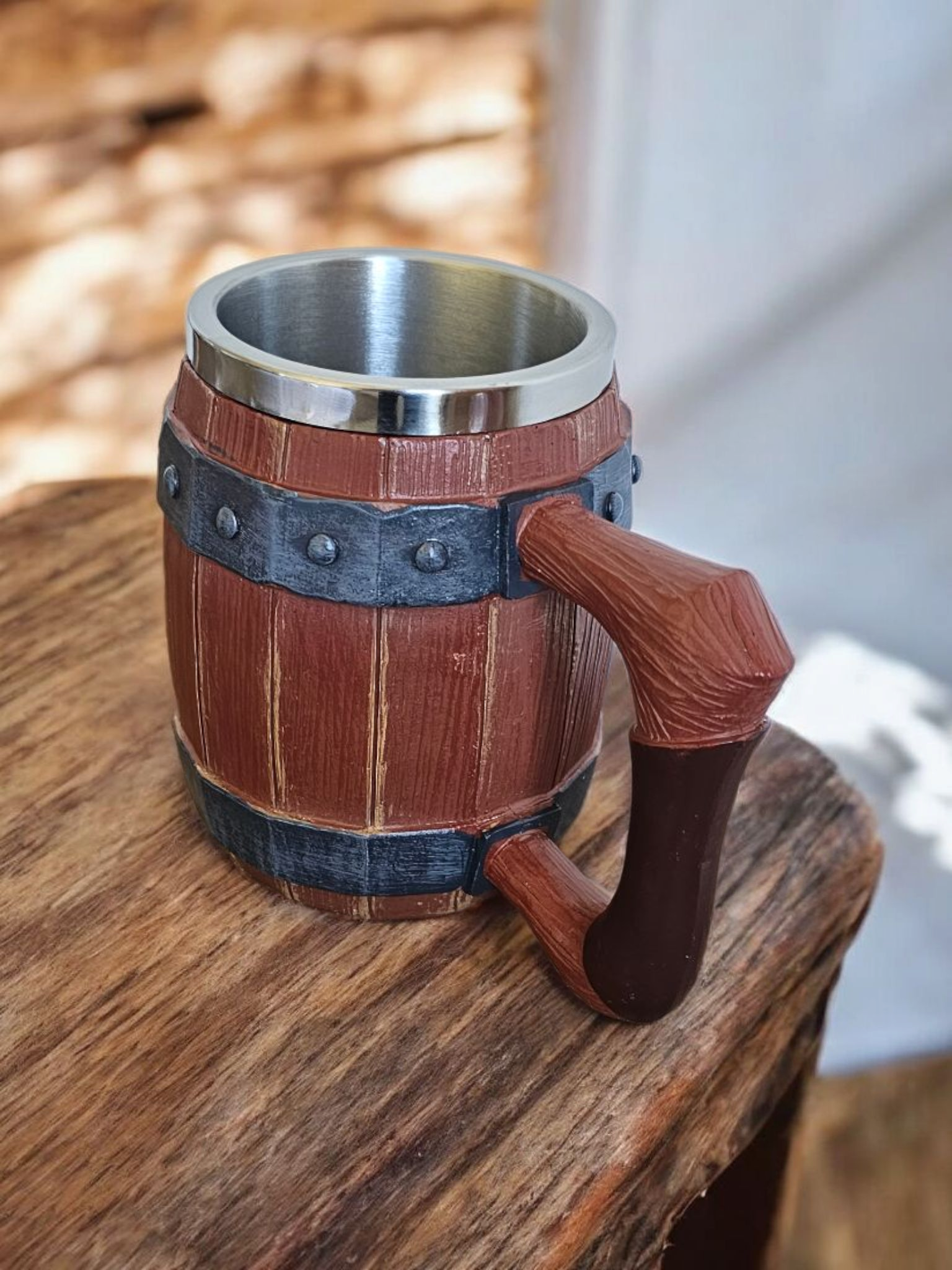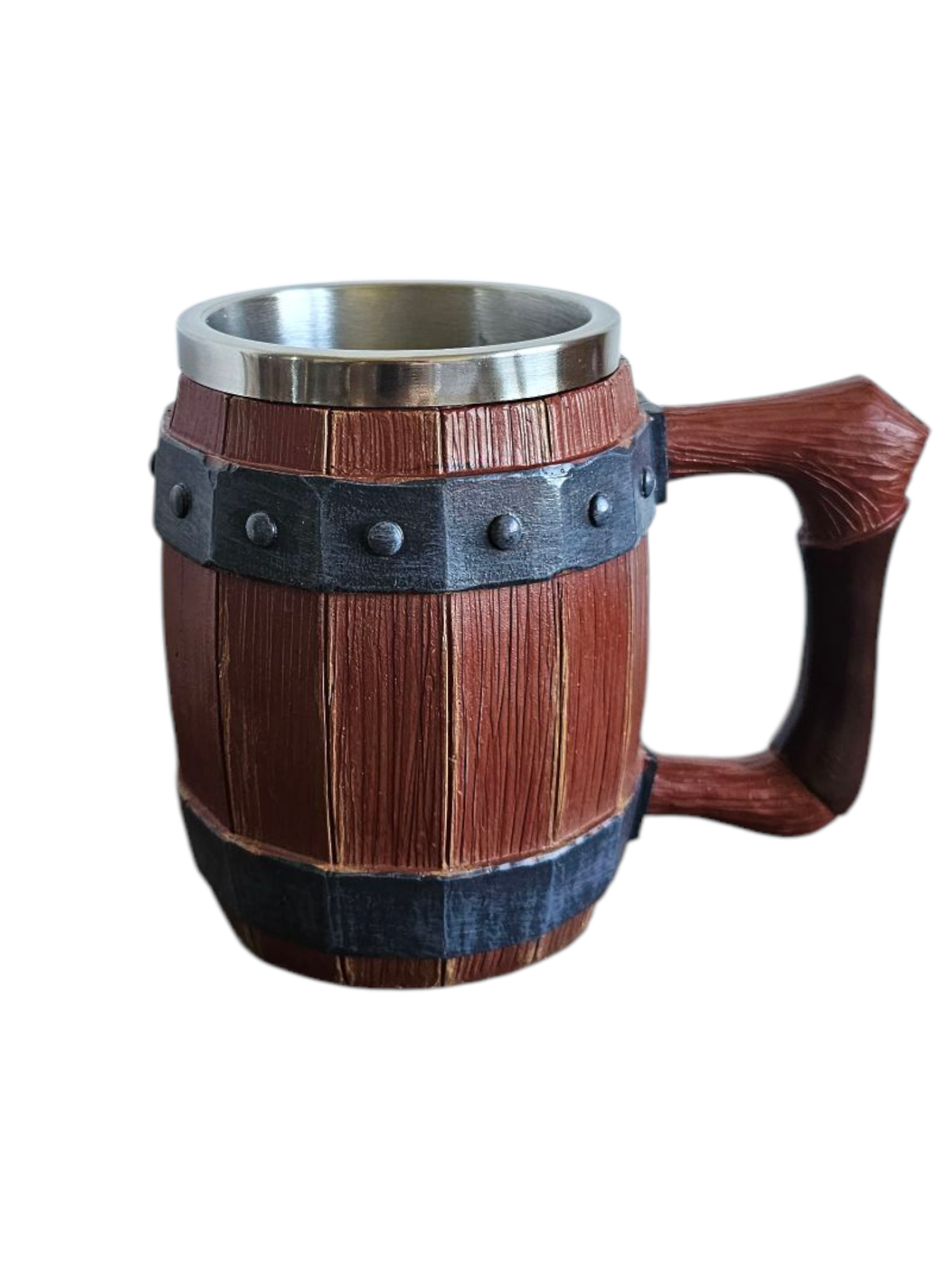 Autentiškas medžio imitacijos dizainas su reljefinėmis lentelių detalėmis ir metalinėmis juostomis su kniedėmis sukuria įspūdį, lyg bokalas būtų pagamintas iš tikros medinės statinaitės. Tvirtas, patogiai išlenktas rankenos dizainas užtikrina stabilų laikymą ir malonų naudojimą.